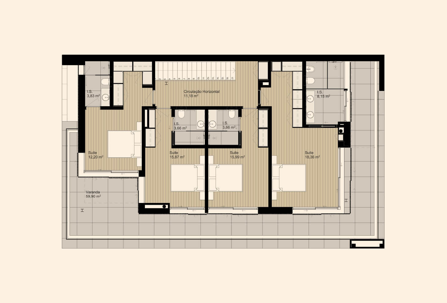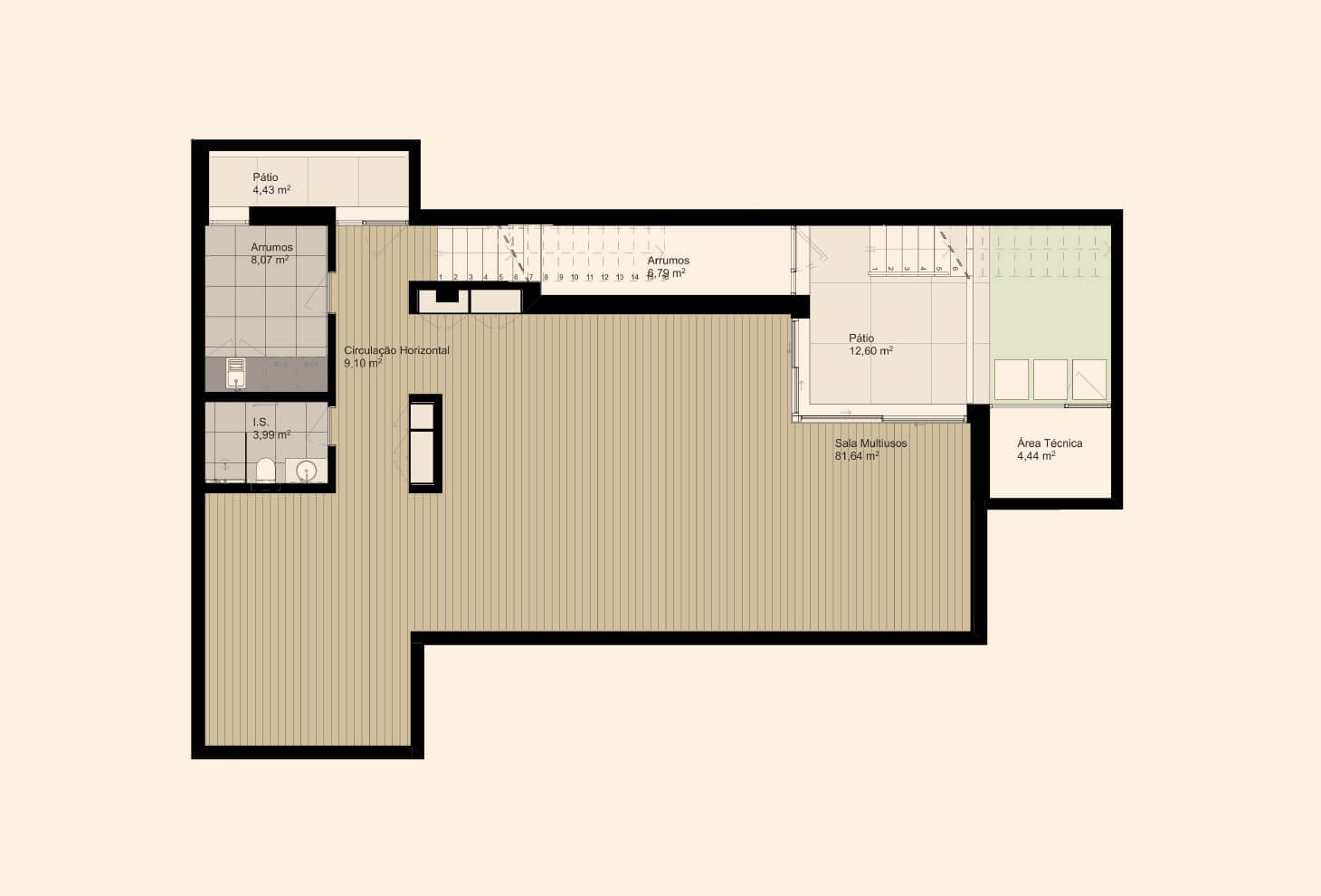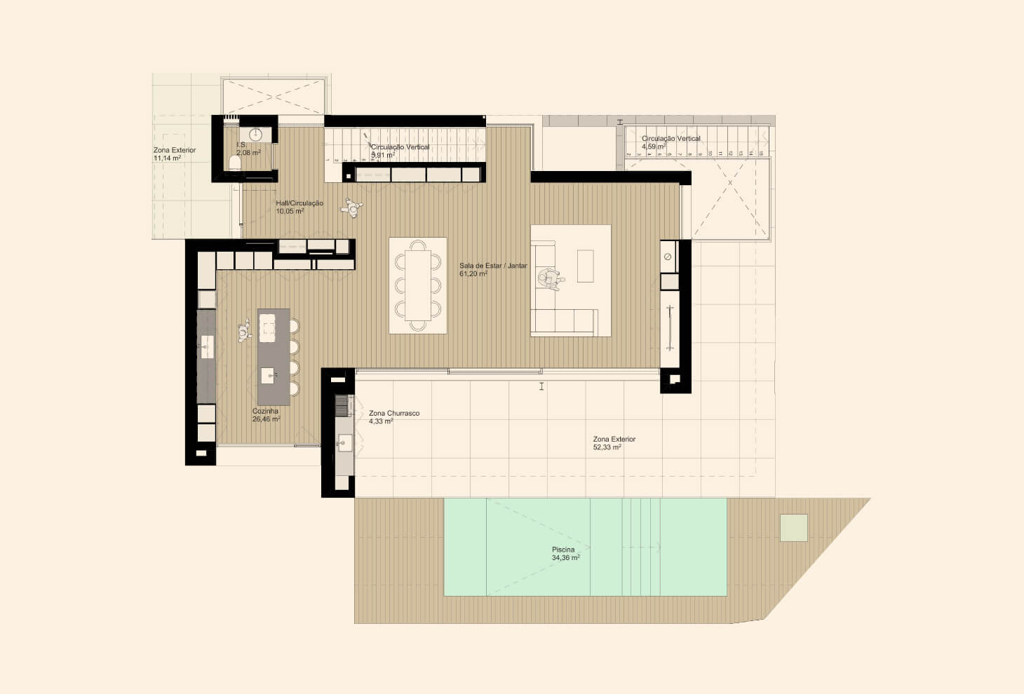 Planta de uma moradia de três pisos (2+cave) inserida em lote de terreno de 482,5 m² e construção acima do solo com 250 m².